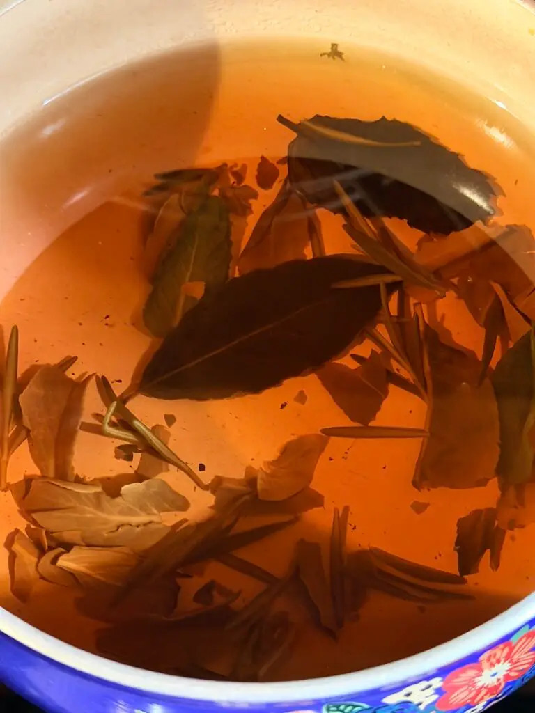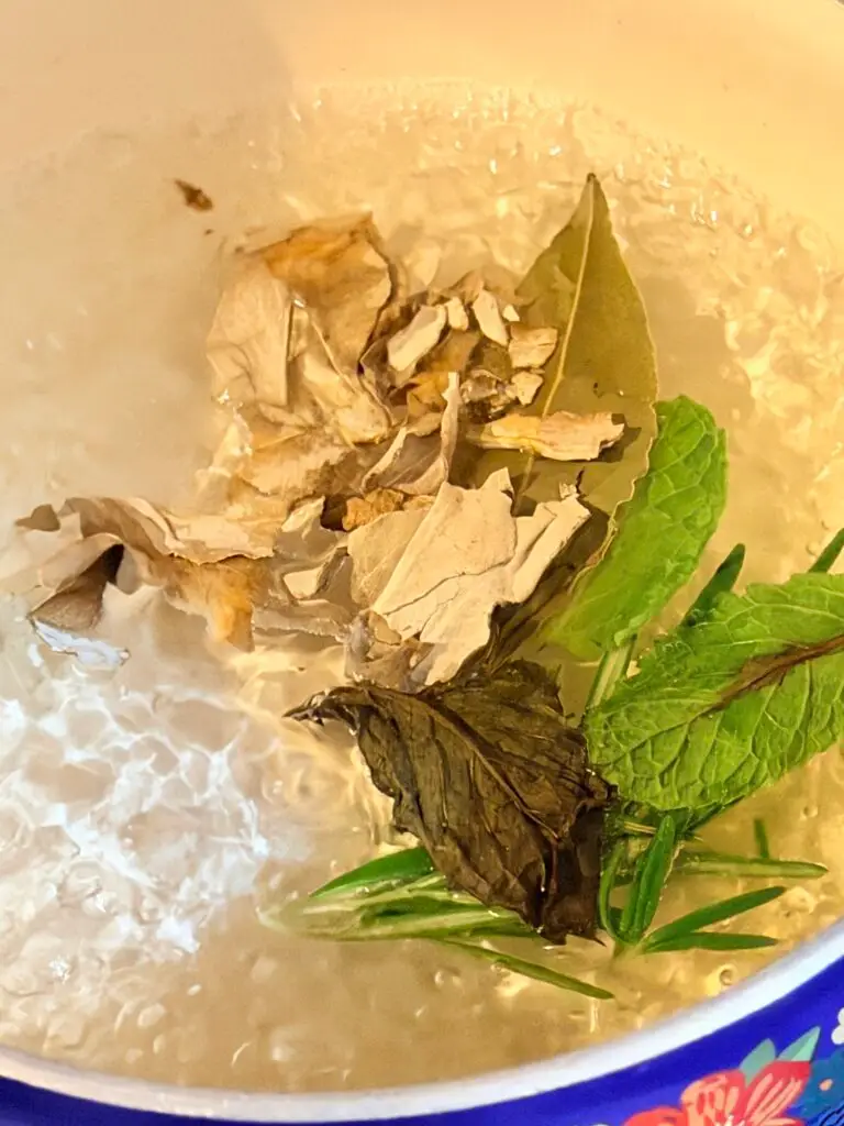 Once the water is hot, add small amounts of your herbs. You don’t need much. A few rosemary leaves, a small amount of mint, a very small piece of white sage, and one bay leaf are enough. Turn off the heat and let the herbs steep as the water cools.